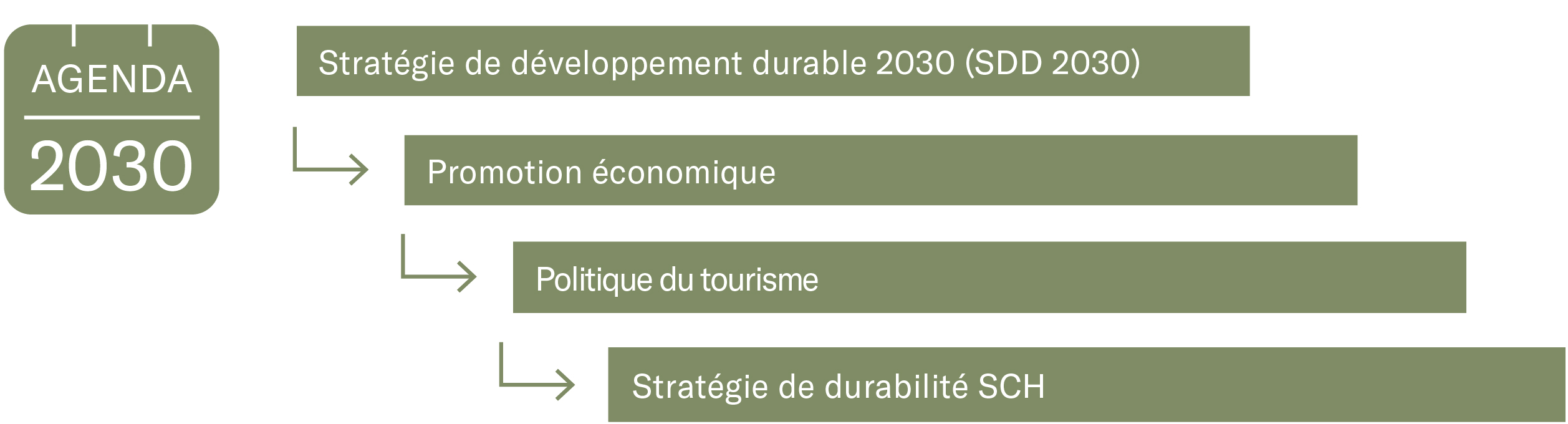 La stratégie touristique adoptée par le Conseil fédéral le 10 novembre 2021 constitue la base de la politique touristique de la Confédération. Les objectifs définissent la direction de la politique touristique et la vision de la Confédération et répondent aux défis du tourisme suisse. Les principales orientations de la stratégie touristique 2017 ont été maintenues, à savoir : améliorer les conditions-cadres, promouvoir l’esprit d’entreprise, saisir les opportunités de la numérisation et renforcer l’attractivité de l’offre et de la présence sur le marché. En outre, l’objectif « Contribuer au développement durable » est désormais intégré. Cela tient compte du fait que le développement durable a gagné en importance pour le tourisme et qu’il offre de nombreuses opportunités à saisir. Outre la politique du tourisme mentionnée, le message sur la promotion économique 2024-2027 ainsi que l’accord CRM prolongé avec le SECO pour la même période, constituent toujours les bases politiques actuelles pour les activités de la SCH.